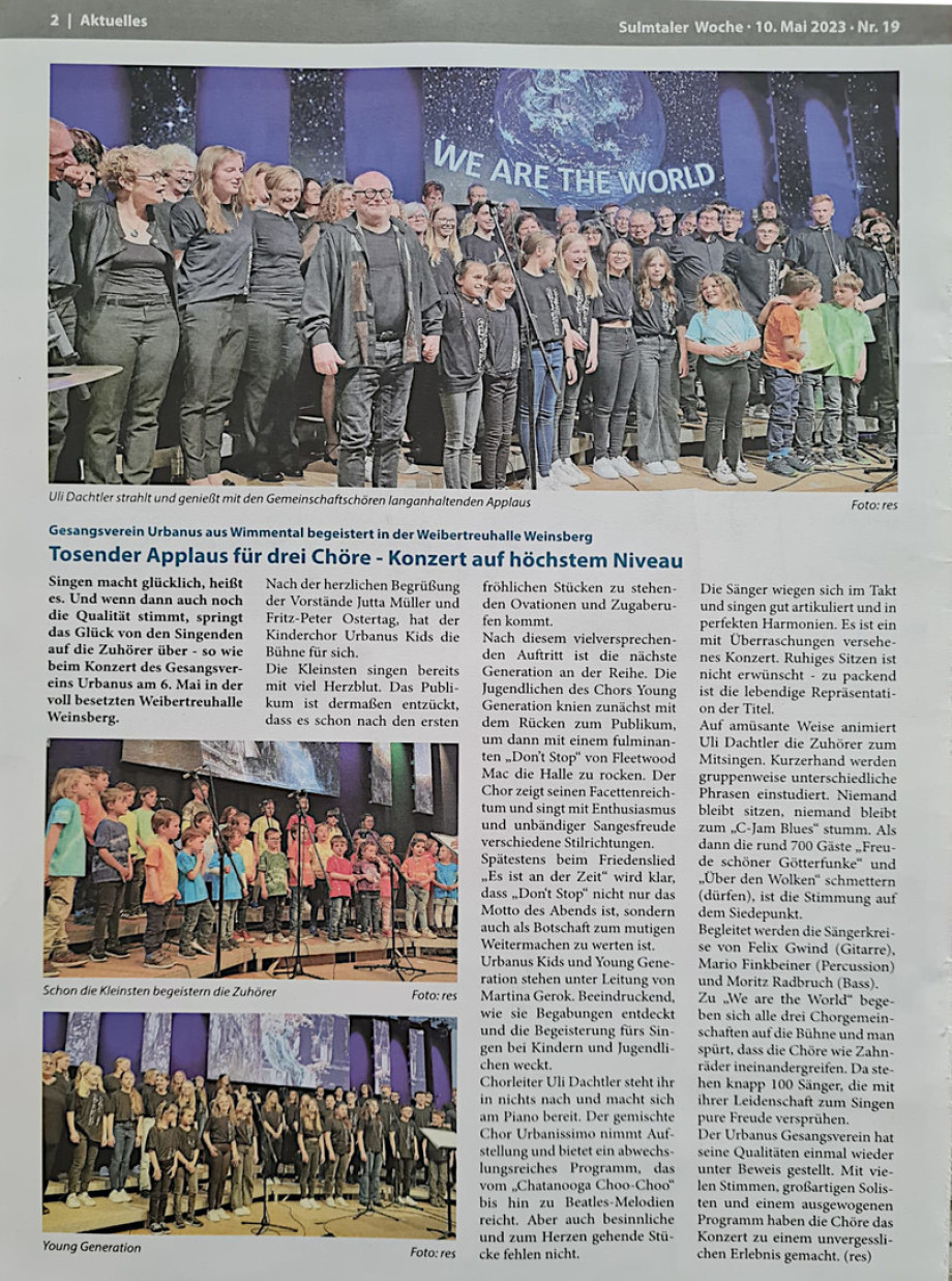 Als zum Finale alle Akteure auf der Bühne gemeinsam „We Are The World“ interpretierten, zeigte sich einmal mehr, dass an diesem Abend die musikalische Welt. Urbanus Wimmental gehörte. Dirigent Uli Dachtler sagte hinterher: „Ich bin total zufrieden und freue mich, dass so viele junge Stimmen bei Urbanissimo nachgekommen sind.“
