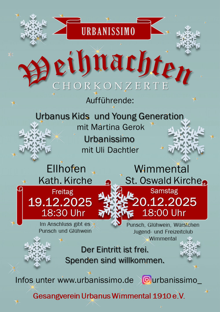 Am 9. Mai 2026 um 19:30 Uhr findet in der Weibertreuhalle in Weinsberg das Jahreskonzert der Urbanus-Chöre aus Wimmental statt. Es wird wieder das